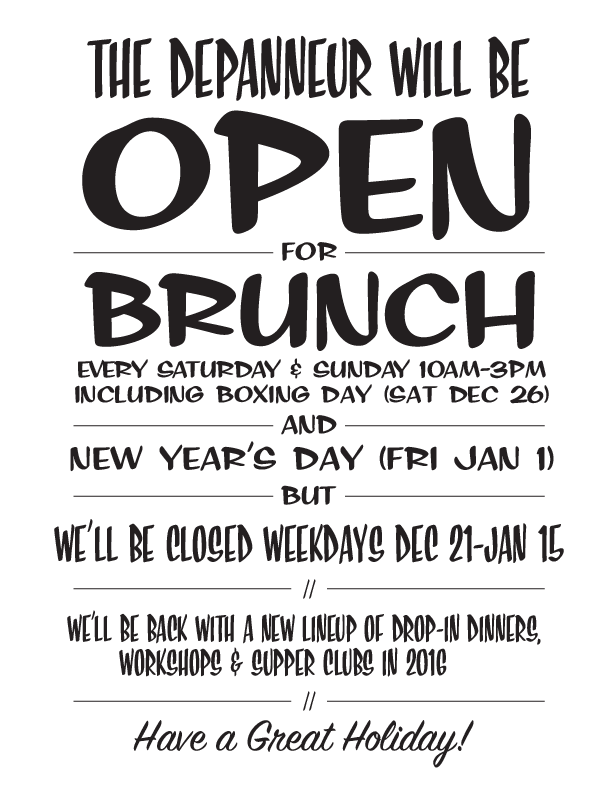 The depanneur will be OPEN for Thick Cut Brunch every Saturday & Sunday 10am–3pm including Boxing Day (Sat Dec 26) and New Year’s Day (Fri Jan 1) We’ll be CLOSED weekdays Dec 21–Jan 15 We’ll be back with a new lineup of Drop-In Dinners, Workshops & Supper Clubs in 2016 Have a Great Holiday!
