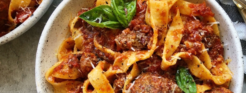 Fettuccine al Sugo: homemade fresh egg pasta, served with a classic Italian sugo: a hearty “Sunday sauce” made with meatballs, pork ribs, lamb, and Italian sausage that’s been slowly simmered with San Marzano tomatoes for 5 hours. Vegetarian option: eggplant parmigiana