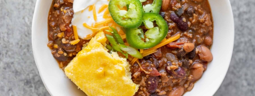 The secreat to a great plant-based chili? Lentils! Packed with protein from those and a bunch of beans, chili is a staple for the colder months ahead. It’s perfect for meal-prepping, freezes well, and is surprisingly versatile: use it as the base for a burrito or shepherd’s pie, throw it on nachos, or even turn it into a nice, cozy bowl of soup. For this meal though, we’ll be using it as the base for bountiful chili bowls. Customize your bowl with an assortment of additions, from rice to corn and roasted sweet potatoes, along with the usual suspects like lettuce and tomato, and rich and creamy plant-based alternatives to cheese and sour cream.