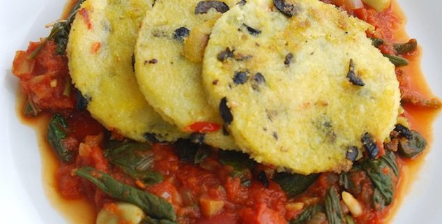 Lemon garlic polenta with homemade tomato sauce, topped with grilled eggplant and shiitake mushrooms.