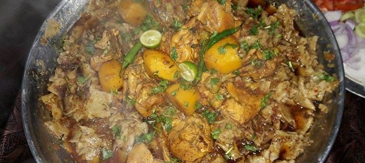 Thin flatbreads are cut into small pieces and soaked in a chicken and potato curry with lots broth and the distinct flavour of roasted Garam Masala, a classic South Asian blend of warm spices like peppercorns, cloves, cinnamon, mace, cardamom, and cumin. It is garnished with onion, tomatoes, coriander leaves, green chillie , lemon and fried onions. It is served with a refreshing yogurt raita, and a simple salad of cucumber and lettuce.