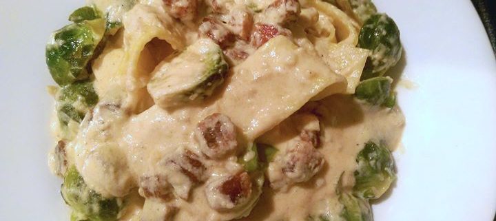Homemade fresh pappardelle pasta with roasted brussel sprouts in a creamy alfredo sauce, with a crispy pancetta or broiled mushrooms.