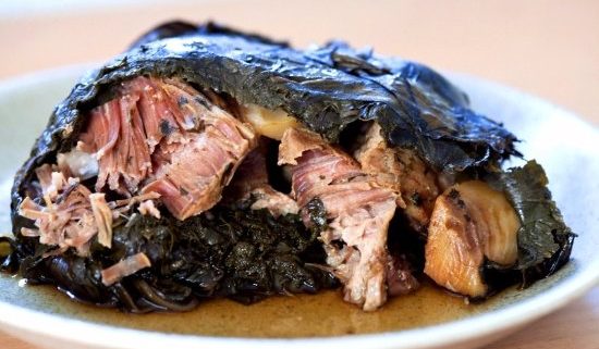 A savory native Hawaiian dish Lau Lau is seasoned chunks of pork belly wrapped in taro leaves and slow cooked to tenderness perfection, served with rice and coleslaw, and garnished with Hawaiian Sea Salt.