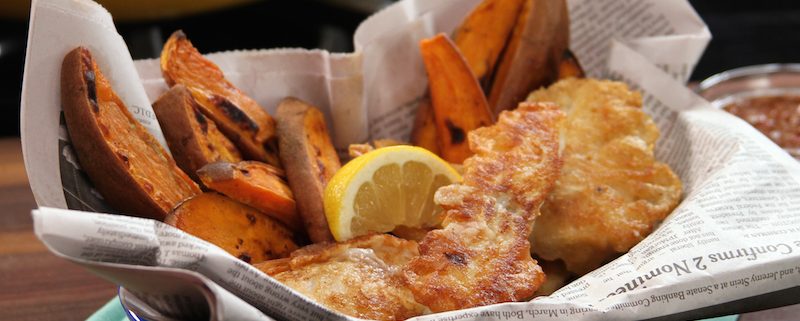 Lauren Hunter is a local artist and avid cook with a passion for eating fresh, preservative-free food. She’s come up with a wonderful take on classic Fish ‘n’ Chips using responsibly-farmed Oceanwise tilapia (veg-fed & no hormones or antibiotics) with a light, crispy crust of flour & fresh dill. It comes with thick-cut roasted potato & turmeric homefries, and two homemade dipping sauces: a tangy lime preserve and a slow-cooked spicy ketchup made with organic tomatoes and maple syrup.