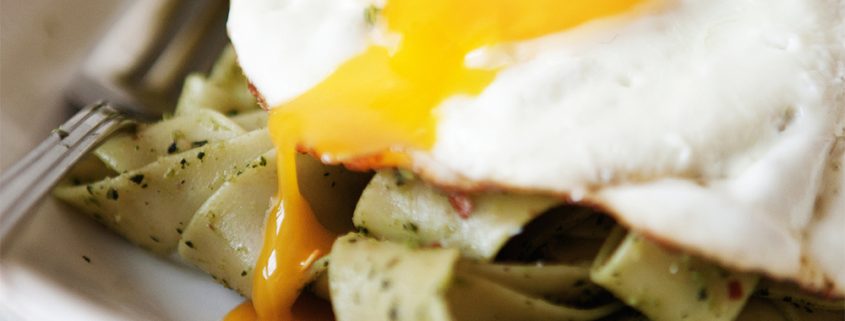 DROP-IN DINNER: Fresh Pappardelle with Arugula Pesto, Peas, Poached Egg, Tuna & Capers by Len Senater