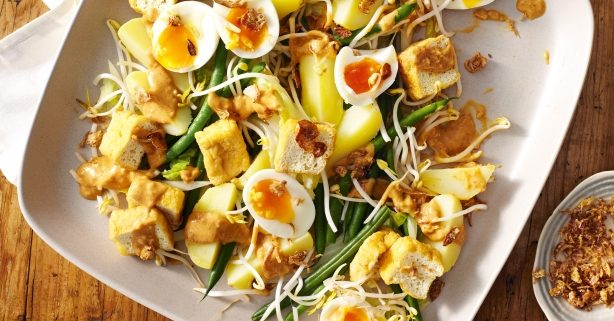 Gado Gado was one of the most addictive dishes I discovered travelling across Indonesia many, many years ago; deceptively simply, infinitely variable, always delicious. Blanched veggies like long green beans, cabbage, choi and bean sprouts, together with cool fresh cucumbers and tomato wedges, share the plate with proteins like fried tofu and boiled eggs (optional). Little cubes of potato or sticky rice, coriander and crispy fried shallots are commonly accompaniments, but the key is the rich, complex and spicy warm peanut and coconut sauce drizzled over the whole shebang. Served with crunchy shrimp or cassava chips.