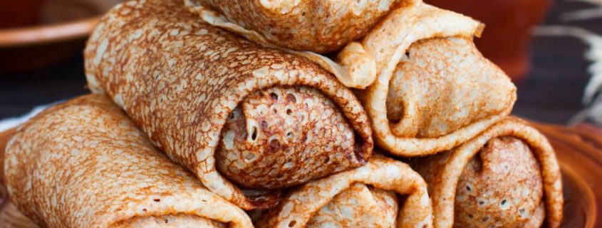 Flour has always been easy to come by in Russia, so generations of cooks have become adept at rolling out doughs into every shape, texture and size imaginable. These thin crepes (blin) are filled with mushrooms, cheese and potato, and served with sour cream.