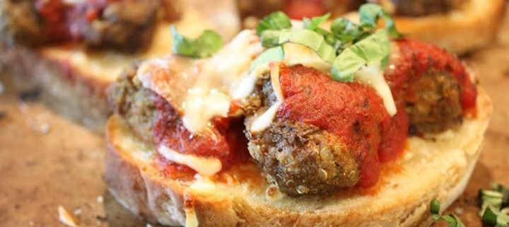 Heavenly open-faced pork/ beef meatball sandwich accompanied by provolone cheese and sautéed peppers and onions. Vegetarian “cheatballs” option also available made with nuts and mushrooms.