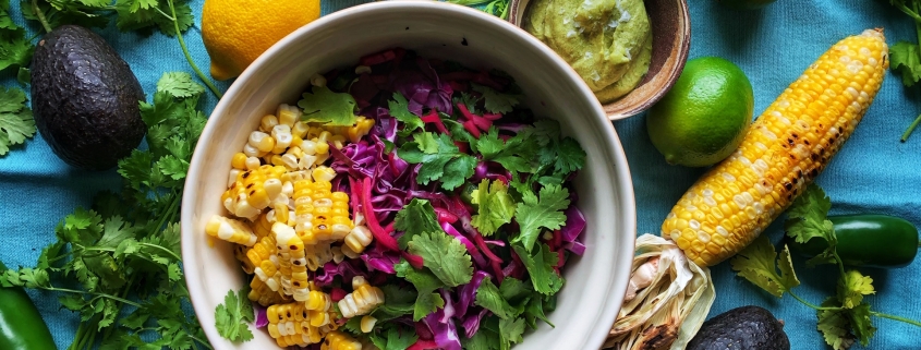 Served with a side of black beans, fried plantains and a crunchy Southwestern slaw containing corn, pickled red onions, cilantro and mixed with a creamy avocado dressing.