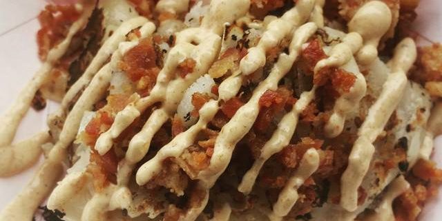 Homemade perogies stuffed with proscuitto, pancetta, chorizo, and potato, served with caramelized onions, mushrooms and cajun sour cream.