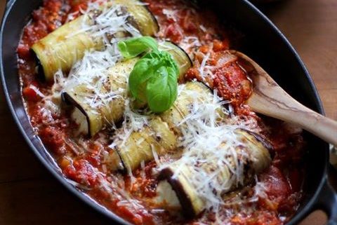 Thin eggplant cutlets rolled around a handmade ricotta, spinach and parmesan filling, on a smoked, spicy tomato sauce (#veg)