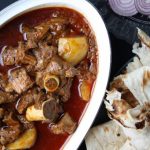 Gumbo: A spicy stew home-style stew of beef, okra and carrots, served with golden rice. Gumbo is the Congolese name for okra, and it is African dishes like this that are the roots of the Cajun and Creole gumbos of the American South. #GF