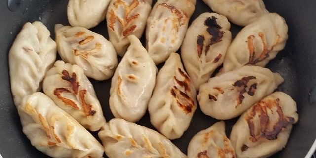 These momos are elegantly leaf-shaped by hand, and then steamed/pan-fried for an extra special bit of golden crust!