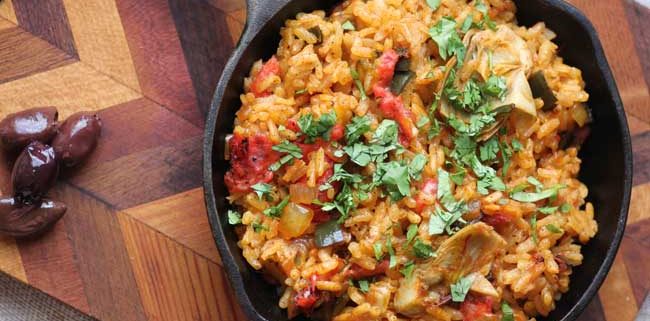 Vegetable paella with celery root, Jerusalem artichokes , and sweet potatoes in fragrant saffron and turmeric rice, with crispy pan-fried tofu fish.