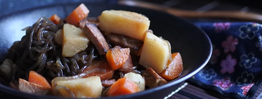 Japanese style “meat and potatoes” stew, with dried mushrooms and yuba as the meat, seasoned with mirin, kombu, and homemade chickpea miso.