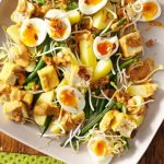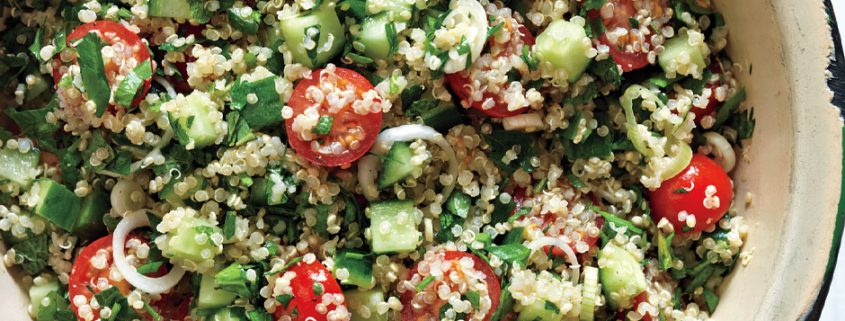 Any lover of Jewish food quickly develops an appreciation for “Appetizings”, the selection of cool salads, spreads and dips familiar to any big family get-together. Emily puts her vegan spin on a few classics: Okara ‘tuna’ salad, Tofu ‘egg’ salad, Quinoa tabouli, served with sprouts and matzoh on the side.