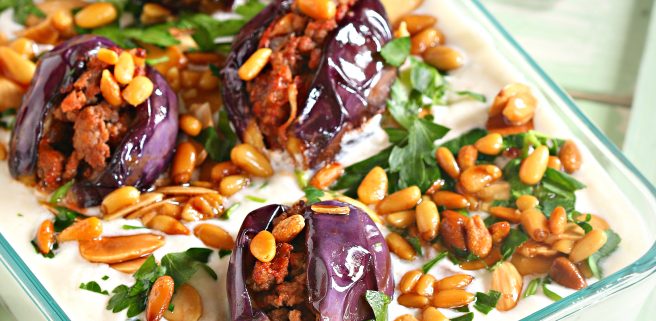 Fatteh (فتّة meaning crushed or crumbs) is a class of southern Levantine dishes made with pieces of fresh, toasted, or fried flatbread layered with yogurt and other ingredients. It is so closely associated with Syrian food that it is also known as shâmiyât (شاميات ) or ‘Damascene’. This version features Maqdoos, small eggplants that are fried until tender and then stuffed with a savoury spiced meat and nut filling. The dish is built up in layers of bread, yogurt & tahini sauce, tomato sauce, eggplants and topped with fresh yogurt, herbs and pine nuts as a garnish. (Note: if the very small eggplants prove to be too difficult or expensive to find, we’ll work with regular eggplants).