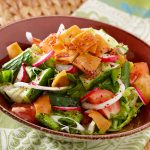 This popular Levantine salad is made using toasted or fried pieces of pita bread combined with mixed greens, fresh vegetables like tomatoes, cucumber and radish, but vary according to season and region. Mint and parsley lend a freshness and fragrance, and dried sumac (the same staghorn sumac that grows here in Ontario) gives the olive oil-based dressing a distinctive tangy flavour.