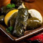 Stuffed grape vine leaves can be found on tables all around the Eastern Mediterranean. This Syrian version features a rice filling seasoned generously with parsley, mint, garlic, onion and black pepper; some cooks add a bit of finely ground coffee that adds complexity and depth. The are baked in a tangy sauce of tomato, lemon, pomegranate and olive oil, and served with handmade flatbread cooked on the domed saj oven.