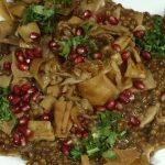 A very old and well-known dish in Syria, the name translates “burning his finger”. The notion is that the dish is so delicious, that diners can’t resist going for it before it cools, so they burn their fingers. Lentils and fresh, hand-cut pasta are cooked together with spices then mixed with onions, coriander, and a tamarind & pomegranate molasses dressing, then garnished with crispy fried pita croutons, caramelized onions, fresh coriander and fresh pomegranate seeds.