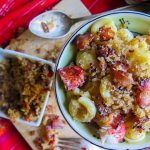 El Rgaga (aka Al Makameer) is a traditional dish from the countryside around Daraa, a city in the southwest of Syria near the border with Jordan. When there is a big occasion with many guests, groups of neighbourhood women get together and make a big batch. Many layers of thinly rolled dough are layered with onions caramelized in olive oil and chicken that has been poached in a spiced broth, and then baked until golden and crispy on top. (The name translates as “the chip”, probably referring to the crunchy top layer that absorbs the flavours of the dish). This dish was originally suggested by Majda, so we reached out to Maryam and her daughter-in-law, who are also from Daraa and experts in making it.
