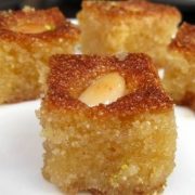 An classic Syrian dessert, a rich buttery semolina and yogurt cake, garnished with almonds and drizzled with a orange-blossom infused syrup.