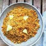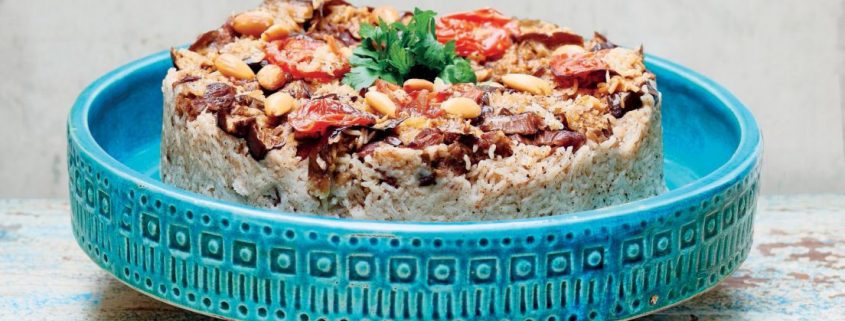 Maqluba is a traditional dish from the Levant that includes meat, rice, and fried vegetables layered in a pot, which is then tipped over before serving, hence the name which translates literally as “upside-down”. This Syrain version of the recipe includes tomatoes, eggplant, poached halal chicken and spiced ground beef, with a garnish of butter-fried nuts.