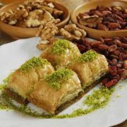Probably the most famous Middle Eastern dessert is this rich, flaky pastry made of layers of paper-thin phyllo dough that’s been brushed with butter, layered with chopped nuts (walnuts), drizzled with sweet syrup flavoured with orange blossom and rose waters, and garnished with crushed pistachios.