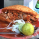 Maqluba is a traditional dish from the Levant that includes meat, rice, and fried vegetables layered in a pot, which is then tipped over before serving, hence the name which translates literally as “upside-down”. This Syrian version of the recipe includes tomatoes, eggplant, poached halal chicken and spiced ground beef, with a garnish of butter-fried nuts.