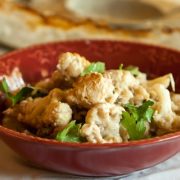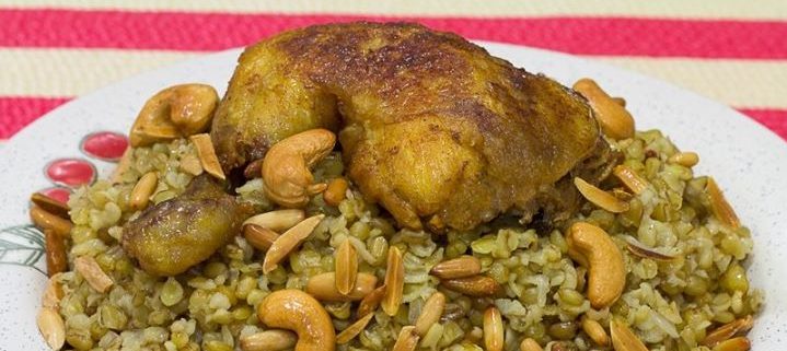 Freekeh is made from green durum wheat that processed in a special way to create a unique flavor. The wheat is harvested while the grains are yellow and the seeds still are soft; it then is piled and sun-dried. The piles are carefully set on fire so only the straw and chaff burn, not the seeds. In these controlled conditions, the high moisture content of the seeds prevents them from burning, but imparts them with a unique smoky flavour. Next, the roasted wheat is threshed and sun-dried before being cracked into smaller pieces so they resemble a green bulgur. This Syrian freekeh recipe is seasoned with onion, butter, black pepper, cinnamon, and cumin, topped with a quarter chicken and garnished with fried nuts.