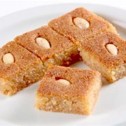 A relative of namoura or basbousa, this is one of the region’s many delicious syrup-soaked semolina cakes. This one doesn’t use yogurt, but rather tahini, milk powder and ghee giving an extra rich cake with a nutty, vanilla flavour.