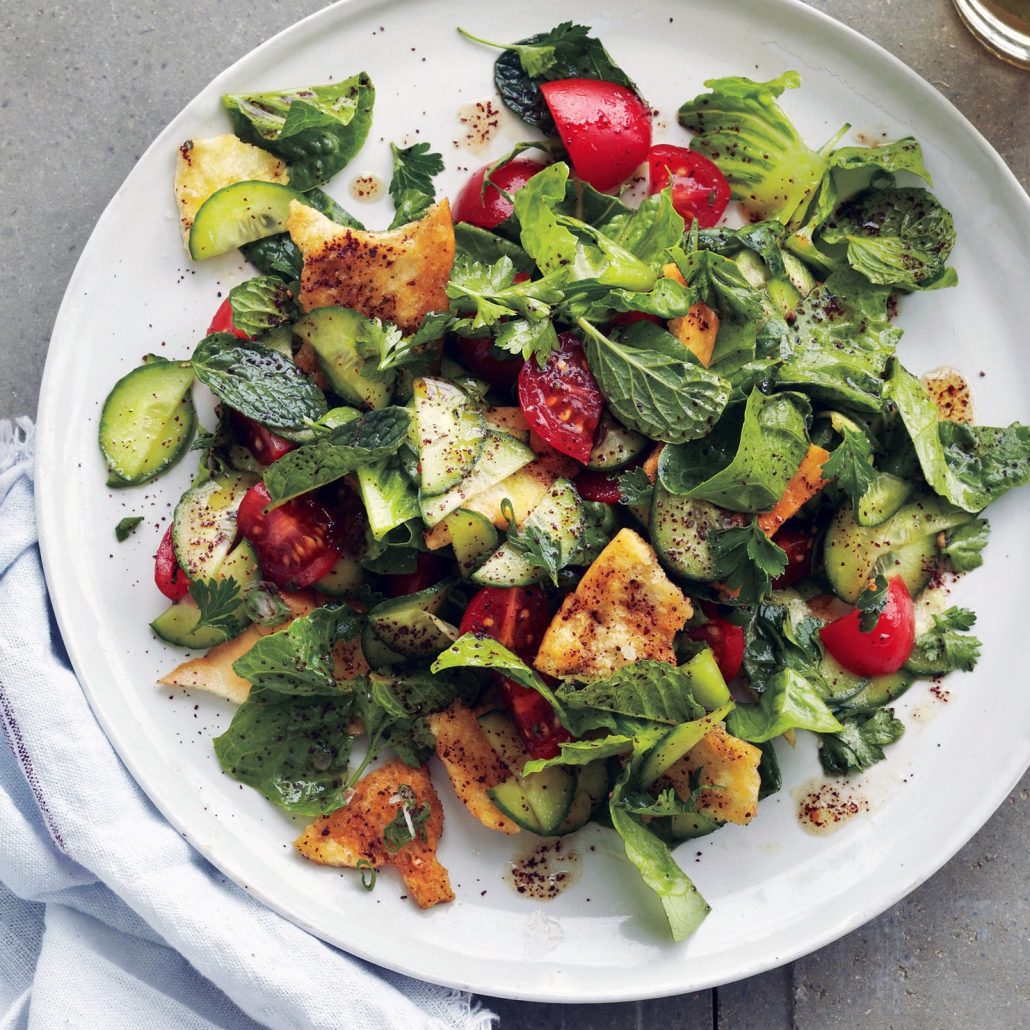 Fattoush is a popular Levantine bread salad made from toasted or fried pieces of pita bread (khubz arabi) combined with mixed greens, fresh vegetables like tomatoes, cucumber and radish,pepper but vary according to season and region. Fresh mint and parsley lend a freshness and complexity, and dried sumac (the same staghorn sumac that grows here in Ontario) gives the olive oil-based dressing a distinctive tangy flavour.