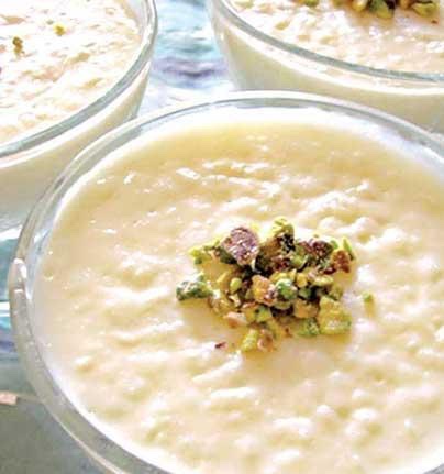 Wherever you find rice, you’ll probably find a version of rice pudding. This creamy Syrian version is scented with cardamom, vanilla and rosewater, and garnished with pistachio.