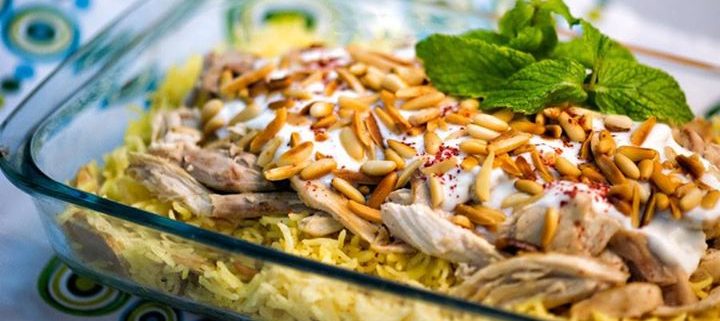 Fatteh (فتّة meaning crushed or crumbs) is a broad category of Levantine dishes made with pieces of crispy flatbread layered with yogurt and other ingredients. It is popular across Egypt, Palestine, Lebanon, Jordan and Southern Syria, but uncommon further North. This dish is so closely associated with Syrian food that it is also known as shâmiyât (شاميات ) or ‘Damascene’. This recipe, by Soheer J. from Sweida, is notable for its use of golden, turmeric-and-spice-infused basmati rice and its garnish of butter-fried walnuts. The dish is built up in layers of bread, rice, yogurt & tahini sauce, chicken, nuts, and garnishes. We will be preparing this dish in parts – crispy bread (dry), rice & chicken (to be warmed) and sauce (room temperature) separately, so they can be combined at the last moment for the best combination of flavours, temperatures and textures.
