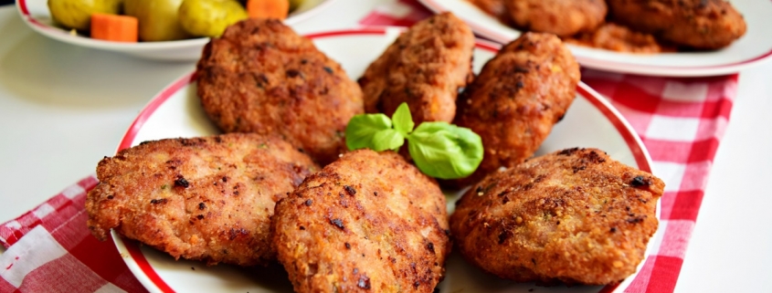 Oversized, juicy meatballs (more like chubby patties or torpedos), made with a mix of ground beef and pork, carrots, garlic, onion and lots of fresh herbs, and rolled in coarse corn grits before frying for a little extra crunch.