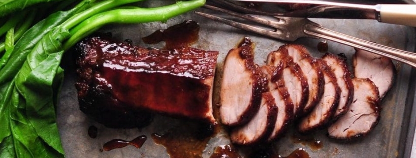 Pork tenderloin char sui (Chinese-style BBQ pork), in a honey-sweet, five-spice glaze served with baby gai lan (Chinese broccoli) in garlic sauce, over oyster mushroom brown fried rice.