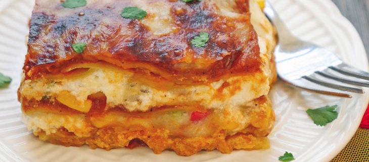 Jalfrezi typically refers to a spicy, stir-fried dish featuring onion, chili, ginger, garlic and tomatoes; this one has a colourful mix of veggies — carrot, beans, cabbage, beetroot, cauliflower — along with fresh paneer cheese. It all gets layered with cashew béchamel, coconut kofta gravy, noodles and cheese for a truly fabulous vegetarian lasagna.