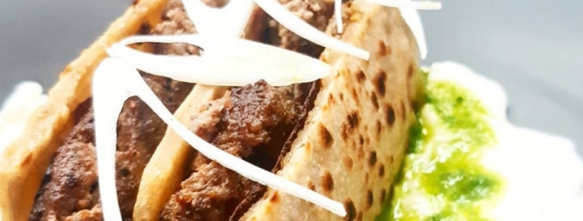 Ground beef tenderized using raw papaya (Gilauti means “melt-in-mouth”), flavored with spices and pan-fried, then wrapped in a large thin roti with a mint & chilli chutney, thinly sliced onions and yogurt.