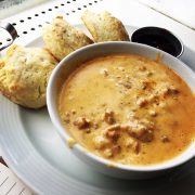 Hand-cut buttermilk biscuits – house-ground sausage gravy – preserves and whipped butter