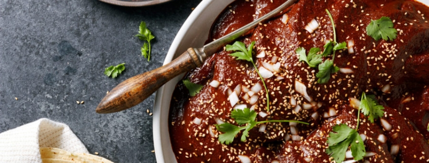 Boneless turkey breast stuffed with cornbread and chorizo stuffing with a complex cacao and chile-infused Puebla-style mole gravy; served with coral yam mash, buttered beans and cranberry chutney.