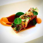 Cherry and fresh cheese pelmeni dumplings, almond creme anglaise
