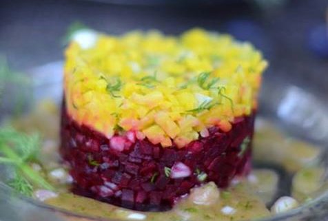 Summer beet caviar with horseradish creme fraiche, vegetable crisps
