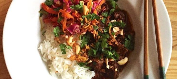 Beef chuck slowly braised with kecap manis, lemongrass, ginger and chilies; served with coconut rice.