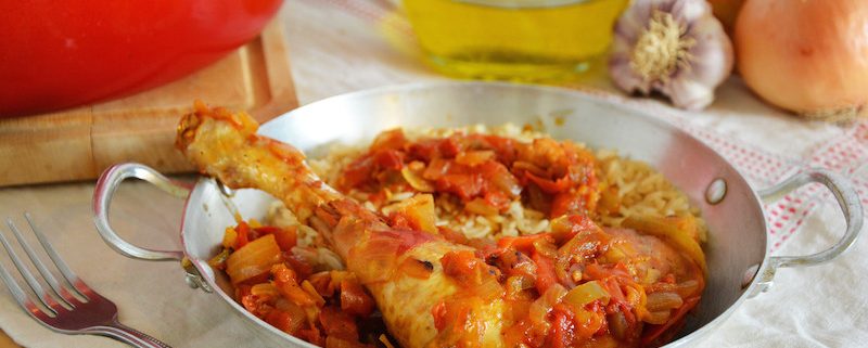 Seared chicken legs are a slow-cooked with a Basque piperade stew of onions, garlic, green & red peppers, plenty of tomatoes, and spiced with the traditional Espelette pepper. Served over rice, with a light green salad.