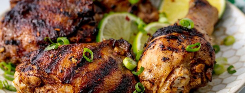 Skinless chicken thighs marinated in classic jerk spices — allspice, scallion, garlic, scotch bonnet — and grilled over charcoal.
