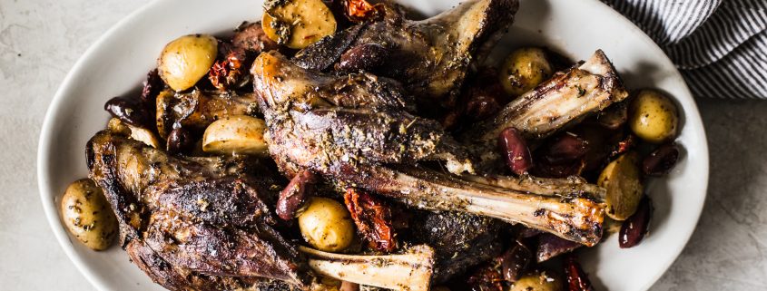 Lamb shanks, marinated for 24 hours in cava, a Spanish sparkling white wine, then slow-cooked with garlic and herbs until it falls off of the bone. Served with patatas a la pobre, (“poor man’s potatoes”) a classic Spanish dish of potatoes & onions cooked in olive oil, and minted fresh green beans.