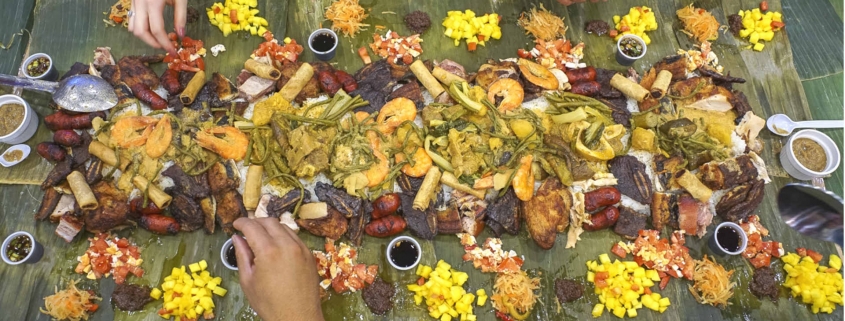 Kamayan is a Tagalog word that translates to “by hand” and refers to a traditional Filipino style of eating—communally, and without plates or utensils. A typical kamayan meal features a table covered in banana leaves which is then artfully arranged with a variety of traditional Filipino dishes served rice, condiments and garnishes.