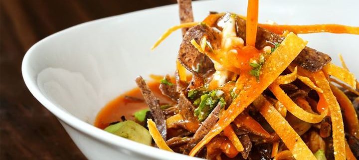 A quintessentially Mexican soup based on a rich chile and tomato infused chicken stock brimming with tender local spring asparagus and crispy corn tortilla shreds, toothsome giant hominy corn and cool, creamy queso fresco; a delightful combination of flavours, textures and temperatures.