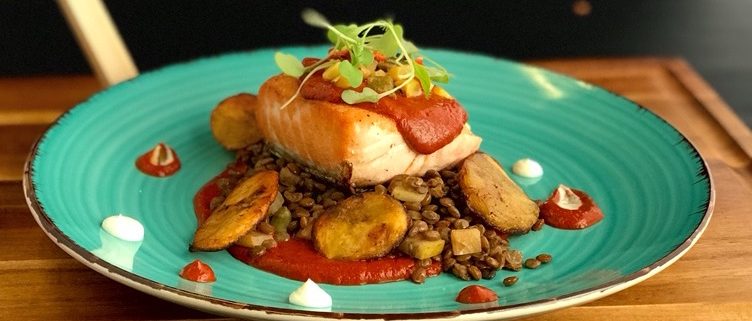 Scratch-made fruity mole with dried plums, apple, pears, raisins, pepitas, sunflower seeds, guajillo & ancho chiles, and a touch of bitter chocolate — served over a warm lentil, apple, and plantain salad, with a grilled corn, poblano & lime relish.