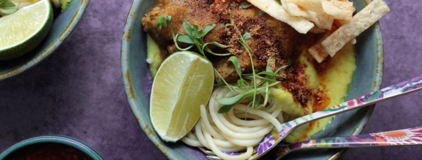 A Pakistani take on a classic Burmese dish, often attributed to Memon traders who brought the dish back from Myanmar and adapted it to local taste and ingredients. A rich and textured noodle dish with beef (or tofu) in a gram-thickened coconut curry, served with an array of colourful and flavourful garnishes: chilli oil, chips, fried onion, ginger, coriander, green chilies, lemon and chaat masala allowing diners to customize their bowl to their taste.